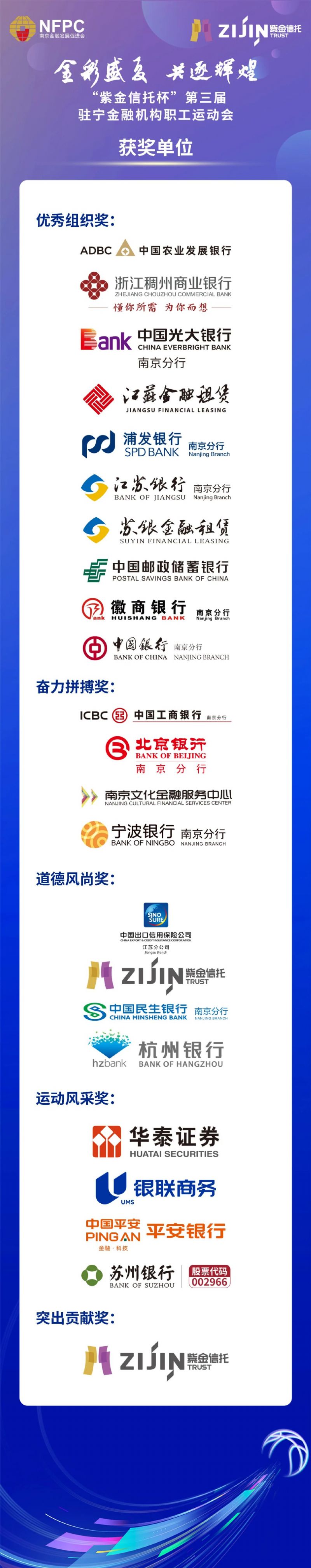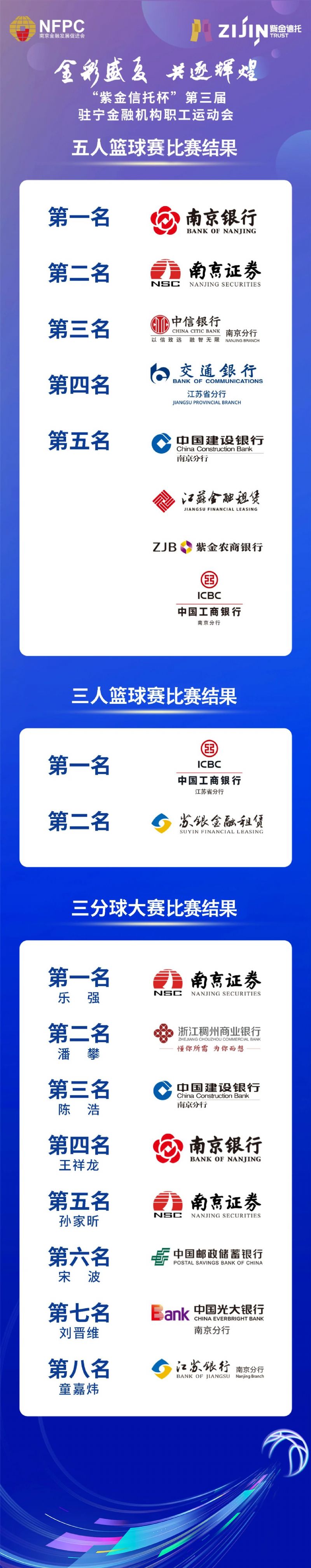本届运动会由市政协指导、南京金融发展促进会主办,紫金信托有限责任公司协办,包括五人篮球赛、三人篮球赛、三分球大赛和羽毛球混合团体赛4个项目,共产生18支获奖队伍。经过激烈角逐,南京银行摘得五人篮球赛冠军,工商银行江苏省分行摘得三人篮球赛冠军,华泰证券南京分公司摘得羽毛球混合团体赛冠军,农业发展银行江苏省分行营业部等10家单位获评“优秀组织奖”,工商银行南京分行等4家单位获评“奋力拼搏奖”,民生银行南京分行等4家单位获评“道德风尚奖”,平安银行南京分行等4家单位获评“运动风采奖”,紫金信托有限责任公司获评“突出贡献奖”。